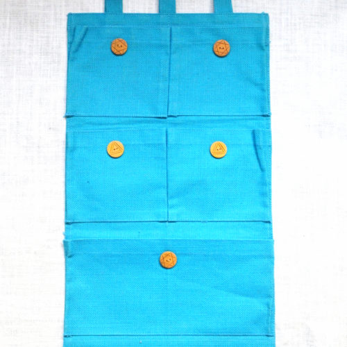 Good quality with design High durability Easy to Carry Trendy & Classic look Product Description 5 pockets Blue Jute with buttons in middle of pocket